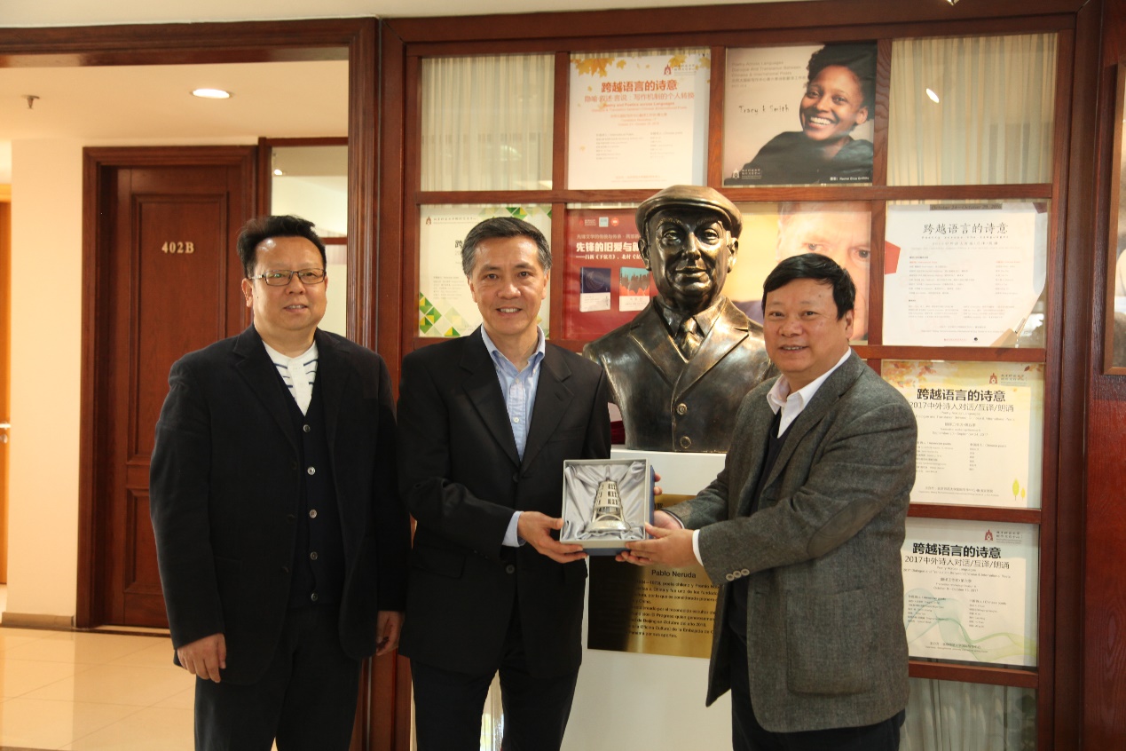 的兄弟情谊,以及当初对铜像摆放位置的决定,“无论铜像是坐落在艺术楼,还是写作中心,我们都感到非常愉悦和荣幸,因为它都是落在了中国,落在了在北师大。我们要学习聂鲁达的博大胸怀。”胡智锋院长还回忆了他在智利演讲时的趣事,智利人民对于艺术的热爱给他留下极为深刻的印象。胡智锋院长激情洋溢的讲述让现场气氛十分热烈。 最后,北师大特聘教授、著名诗人欧阳江河致辞。他将二十世纪的诗人分为两类,一类是走向知识与复杂观念的诗人,一类是大地般广阔的游吟诗人。他认为,聂鲁达是后者中最伟大的诗人,他直接超越了风格与历史,属于整个文明,并与自然、生命、阳光、花朵、风、永恒……息息相关。他说道,每次来到写作中心,都能看见北师大文学创作专业的学子在这里自习,那么从此以后,学生们的研习、阅读、讨论,将要经受几束目光的注视、祝福与提醒:不仅有莫言先生活生生的目光,有鲁迅先生照片里的目光,还有聂鲁达那由青铜浇筑的目光。今天,我们见证了这三束目光的交汇,将来,这些目光会永远感召我们,会融入到来者的生命之中,并成为北师大重要的风景。 随后,周作宇副校长向贺踊参赞夫妇、王薛彤主席赠送精美的纪念品。嘉宾们共同为巴勃罗·聂鲁达铜像揭开红幕,留下合影。 仪式的最后,当代文学博士生、北师大国际写作中心秘书贺嘉钰与当代文学留学生、来自阿根廷的Ema Indira Velazquez Burmester分别用中文、西班牙语朗诵了聂鲁达的诗篇。其中一首《中国大地之歌》,是聂鲁达访华期间与艾青交往后,两位诗人互赠的作品。聂鲁达是一位大地诗人,而中国也拥有广袤富饶的大地,他曾对中国的土地这样诉说:“我只是想用/自己的双手/抚摸你的绿色的胸膛/让你的黏土来塑造我/让你的风来创造我/我想成为/你的黏土和风的原始的儿子”。而艾青也在给聂鲁达的赠诗中深情写道:“我们来自许多国家/包括许多民族/有着不同的语言/但我们是最好的兄弟……我们的世界/好像很大/其实很小/明天,要是天晴/我想拿铜管的望远镜/向西方眺望/太平洋的那边/是我的家乡/我爱这个海峡/也爱我的家乡”——看来,从今以后,我们不再需要用望远镜去“眺望”聂鲁达了。