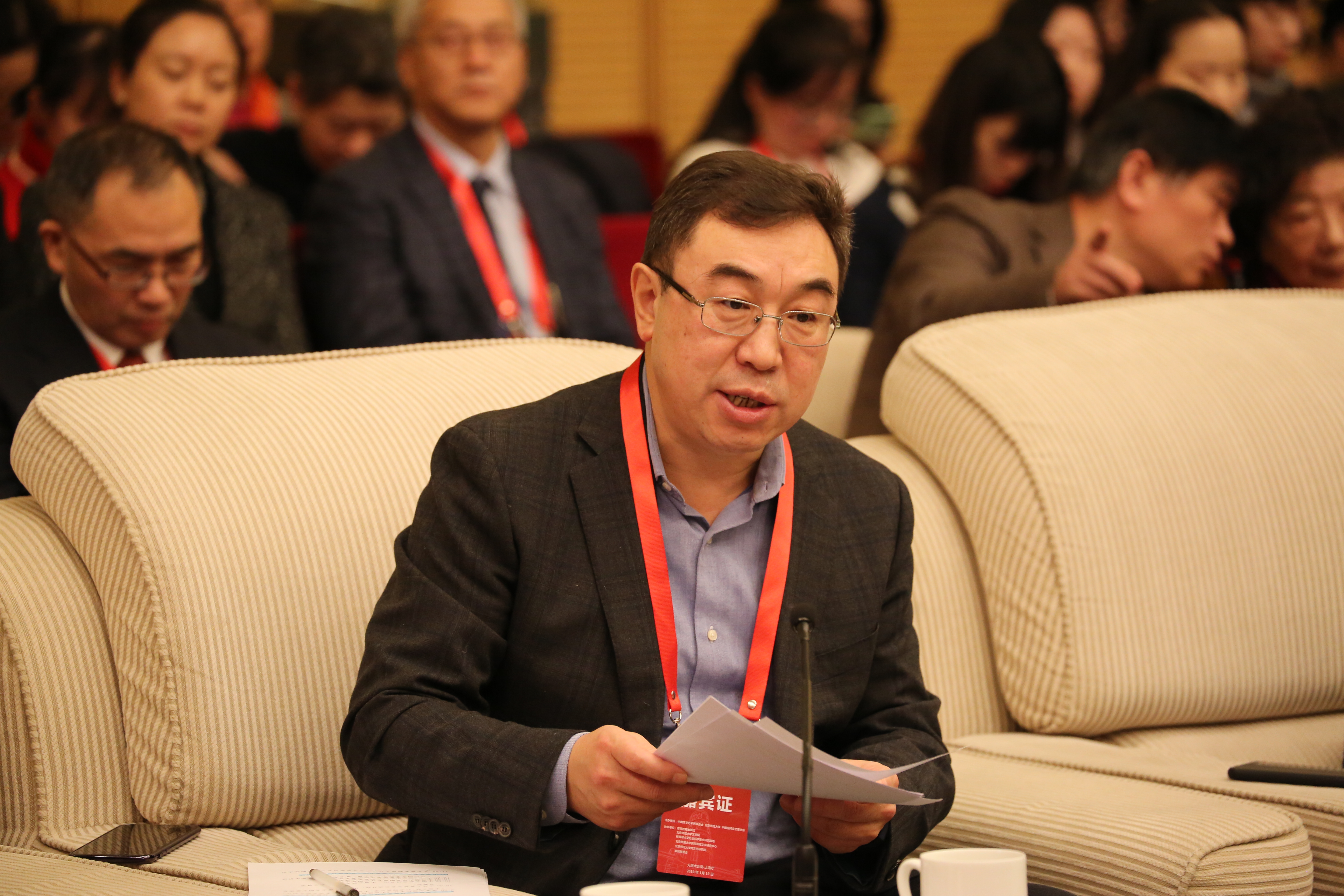 、教育部人文社科重点研究基地北师大民俗典籍文字研究中心、北京师范大学跨文化研究院和敦和基金会联合协办。中共中央宣传部出版局领导莅临会议并指导。中国文联党组书记、副主席李屹,中国文联副主席、书记处书记陈建文,中宣部出版局副局长许正明,中国民间文艺家协会分党组书记、驻会副主席邱运华,中国文联副主席、中国民间文艺家协会主席潘鲁生,北京师范大学副校长郝芳华,高等教育出版社党委书记、社长苏雨恒等出席大会并讲话。中国文联副主席、书记处书记陈建文先生主持大会。 中国文联副主席、书记处书记陈建文先生主持大会(曹文瀚摄) 陈建文书记宣布大会开始,并在简短的致辞中,概括了“中国民俗学之父”钟敬文先生的生平业绩和《钟敬文全集》出版对于弘扬中国优秀传统文化的重大价值。他说,2018年与2019年之交《钟敬文全集》首次出版,这是文化领域的一件大事,一件喜事。钟敬文先生参加过五四运动,曾留学日本早稻田大学,回国后投身中国人民抗日战争争取国家独立和民族解放的伟大事业,同时在高校执教,并在新中国成立后至改革开放时期走过社会主义新文化建设和我国高等教育事业发展的全程,他是20世纪中国杰出的爱国知识分子,是成就卓越的中国民俗学家、民间文艺学家、文艺理论家、诗人、散文家、作家和社会活动家,在国际上也有重大影响。钟先生也是为数寥寥地受到毛泽东、邓小平、江泽民等几代国家领导人接见过的高校学者,学问领域涉及民俗学、民间文艺学、传统国学、文艺学、社会学、人类学、民族学、历史学、古典文学、现代文学、诗词格律学、新闻学、比较文学与世界文学等多个领域,是当之无愧的文化巨匠。《钟敬文全集》全面展示了钟先生的重大成就,具有不可估量的学术价值、社会现实意义和未来传承意义。 中国文联党组书记、副主席李屹先生讲话(曹文瀚摄) 中国文联党组书记、副主席李屹先生首先讲话。他全面而深入地阐述了钟先生在20世纪中国文化史、学术史、教育史和现代社会史中的重大贡献,指出,在《钟敬文全集》出版之际,纪念这位世纪巨匠,就是要学习他始终坚定理想信念、心系国家与民族的价值追求,坚定文化自信、坚守中华文化立场的艺术理念,坚持深入生活、博观约取的治学风格,以及虚怀若谷、甘为人梯的崇高风范。改革开放40年的今天,中国特色社会主义迈入了新时代,社会主义文艺事业也站在了新的历史起点上。今年将迎来新中国成立70周年,在这继往开来的伟大历史时刻,文艺不能缺席,文艺工作者更不能缺席。中国民间文艺家协会正在实施中国民间文学大系出版工程等国家重点文化项目。希望广大民间文艺工作者秉承钟敬文先生留下的重要理论成果和实践原则,恪守严谨治学精神,不忘初心、担当作为,努力为中华民族留存珍贵鲜活的文化记忆,为繁荣发展社会主义文艺事业作出新的更大贡献。 中宣部出版局许正明副局长(曹文瀚摄) 《钟敬文全集》是中宣部出版局立项的国家重点图书项目,中宣部出版局副局长许正明出席会议并讲话。他高度评价民俗文化和民间文化艺术在优秀传统文化中的地位,指出,我国民俗文化和民间文化艺术源远流长、博大精深,植根于深厚博大的中华传统文化沃土,是中华传统文化的重要组成部分,也是中华文明的重要承载和体现。习近平总书记提出,中华优秀传统文化是中华民族的突出优势,是中华优秀传统文化的重要符号和独特标识。中华民俗伟大复兴需要以中华文化繁荣发展为条件,必须结合新的时代条件,传承和弘扬好中华传统优秀文化。《钟敬文全集》的出版,是贯彻落实习近平新时代中国特色社会主义思想的重要举措,是传承弘扬中华优秀传统文化的重要成果,主要有三个重要特点:一是内容权威。全集作为国家重点项目,由钟敬文先生几代弟子和国内学者,包括文艺学、古典文学、现代文学、诗词学等多学科的著名学者担当编纂整理的工作。历时八年才得以完成。无论是出版内容,还是编辑出版团队,都代表了国内最高水平。二是全面系统。全集30册,逾1000万字,是钟敬文先生作为民俗学者、文艺理论家、作家、诗人、散文家、教育家、社会活动家于一身的著作的集大成者。全面反映了钟敬文这位大师的学术文化思想成就,对民俗学、社会学、历史学、语言文字学、艺术学、人类学、民族学、比较文学和世界文学的基础研究学科建设和人才培养,都具有很高的学术价值和深远的社会影响。三是具有国际视野。全集展现了钟敬文先生广阔的学术视野和自觉的跨文化交流的意识,比如,《钟敬文全集》第16册的文艺学研究,展现了钟敬文先生运用马克思主义文艺学和吸收俄罗斯文艺学、法国社会学等西方学说。并结合中国实际的综合运用成果;第17册、18册的鲁迅研究,展现了钟敬文先生利用留学日本的学术积累与优势和成果;第19册国际交流,涉及近十个欧美亚国家。有这样的视野和学术胸怀,奠定了钟敬文先生学问博大精深、纵横捭阖的学术特色。2017年中央两办下发了关于实施中华艺术传统文化传承发展宗旨的意见,贯彻落实两岸意见精神,中宣部将进一步支持中华艺术与传统文化的研究、整理和传承工作。衷心希望高等教育出版社以出版钟敬文全集为契机,认真总结本书出版的成果经验,继续加强与学术界